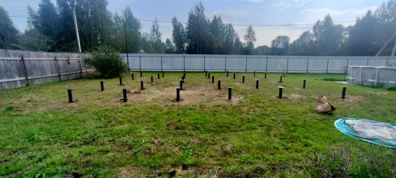 После установки свай на каждую из них были закреплены оголовки. Этот этап крайне важен, так как оголовки служат опорой для будущей обвязки фундамента. Правильная установка оголовков гарантирует, что дом будет иметь ровное и прочное основание.