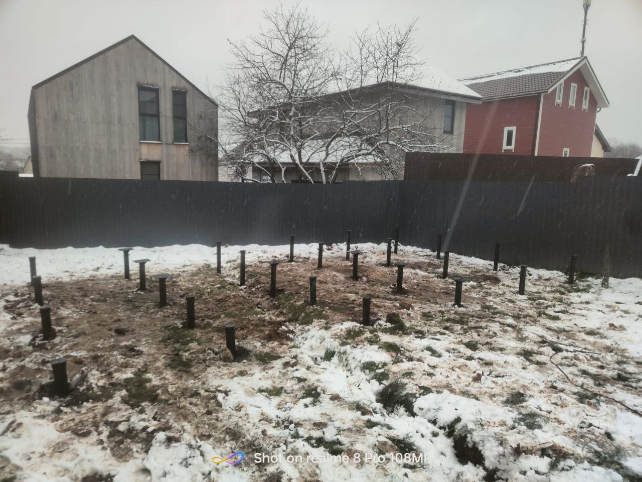 На объекте было установлено 27 винтовых свай. Каждая свая закручивалась по всем правилам технологии с использованием специализированного оборудования. Мы всегда соблюдаем строгие стандарты монтажа: сваи должны быть установлены на нужную глубину, а их вертикальность и горизонтальность проверялись на каждом этапе. Это гарантирует, что в дальнейшем фундамент будет устойчивым и надежным.